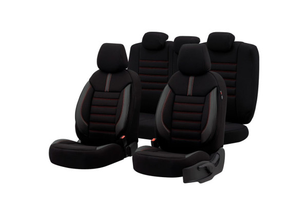 Juego de Fundas de Asiento Universal otoM Tela/Cuero 'Limited' Negro + Costuras Rojas - 11 piezas - compatible con Airbags Laterales
