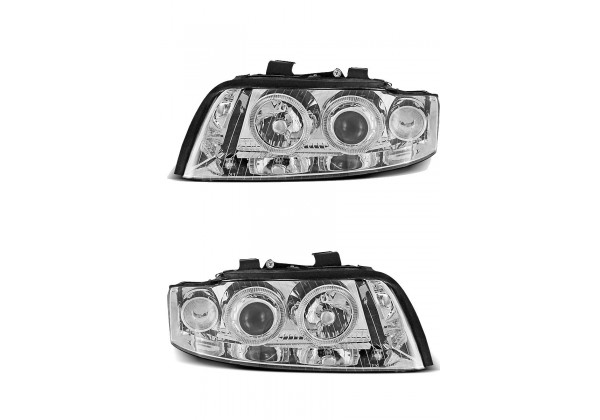 Juego de faros delanteros Audi A4 10 00-10 04 Ojos De Angel Cromados Aprobación E-marcado (producto Homologado) Luz De Posicionamiento: Ojos De Angel Luces De Giro: P21w Luz Baja: H7 Luz Alta: H7 Preparado Para Regulacion Electrica montaje conectar y listo sin modificaciones