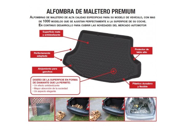 Fabricadas en plástico de alta calidad que sean duraderas y flexibles.Superficie antideslizante para prevenir deslizamientos en la carga.Resistente a altas y bajas temperaturas.Resistente a los aceites y derrames quí­micos.Poseen un labio de proteccion alrededor del borde para atrapar los liquidos y la suciedad.Flexibles y ligeros, permitiendo una facil instalacion o retirada para su limpieza, se pude enrollar para un almacenamietno o transporte.Estan diseñadas para seguir permitiendo la utilizacion de los ganchos de amarre del maletero.Faciles de limpiar.Totalmente reciclable.Sin olor.Con un aspecto elegante gracias al acabado de su superficie.Con 3 Años de garantí­a sobre defectos de la fabricación.