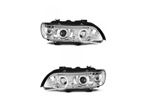 Juego de faros delanteros Bmw X5 E53 09 99-10 03 Ojos De Angel Cromados Aprobación E-marcado (producto Homologado) Luz De Posicionamiento: Ojos De Angel Luces De Giro: P21w Luz Baja: H1 Luz Alta: H1 Preparado Para Regulacion Electrica montaje conectar y listo sin modificaciones
