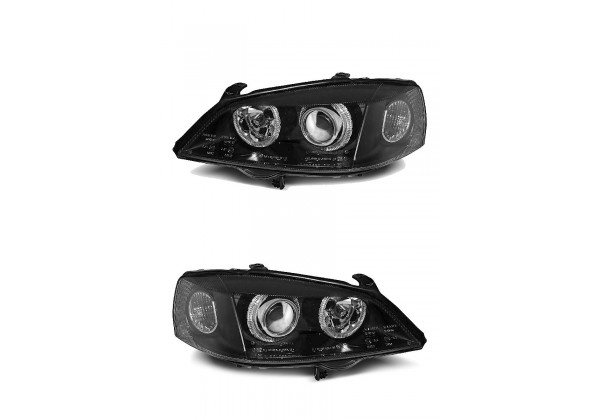 Juego de faros delanteros Opel Astra G 09 97-02 04 Ojos De Angel Negro Aprobación E-marcado (producto Homologado) Luz De Posicionamiento: Ojos De Angel Luces De Giro: P21w Luz Baja: H7 Luz Alta: H7 Preparado Para Regulacion Electrica montaje conectar y listo sin modificaciones