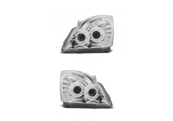 Juego de faros delanteros Toyota Land Cruiser 120 03-09 Ojos De Angel Cromados Producto No Homologado Luz De Posicionamiento: Ojos De Angel Luces De Giro: W21w Luz Baja: H7 Luz Alta: H1 Preparado Para Regulacion Electrica montaje conectar y listo sin modificaciones