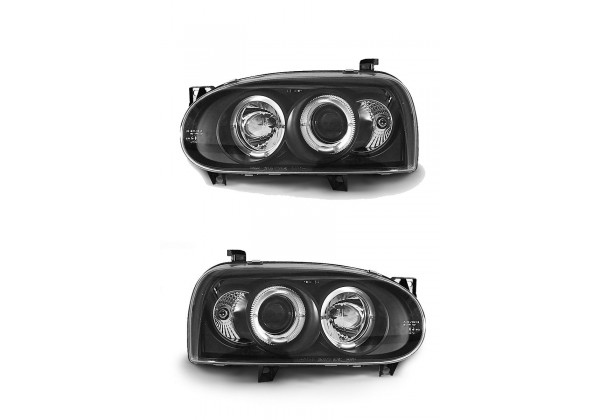 Juego de faros delanteros Vw Golf 3 09 91-08 97 Ojos De Angel Negro Aprobación E-marcado (producto Homologado) Luz De Posicionamiento: Ojos De Angel Luz Baja: H1 Luz Alta: H1 Preparado Para Regulacion Electrica montaje conectar y listo sin modificaciones