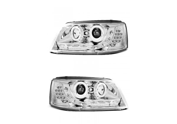 Juego de faros delanteros Vw T5 04 03-08 09 Daylight Cromados Faros Con Luz De Posicionamiento En Funcion Leds Producto Homologado Luz De Estacionamiento: Led Luces De Giro: Led Luz Baja: H1 Luz Alta: H1 Regulation: Electrica montaje conectar y listo sin modificaciones
